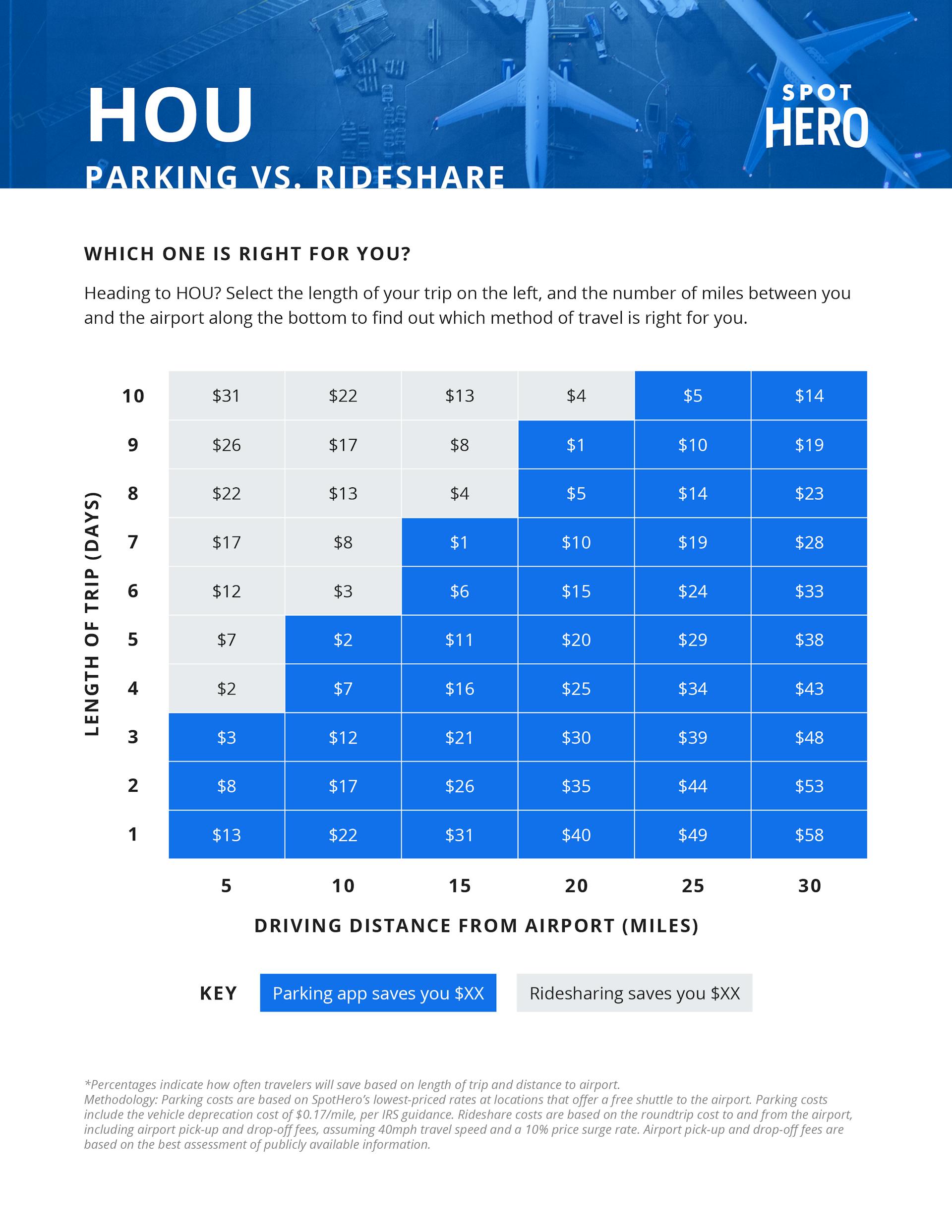 SpotHero has Hobby Airport parking rates from $4 - $15 per day.